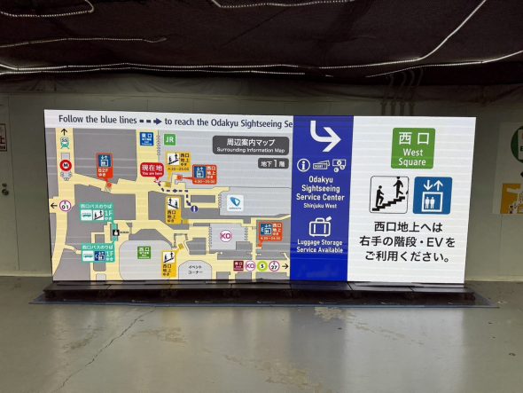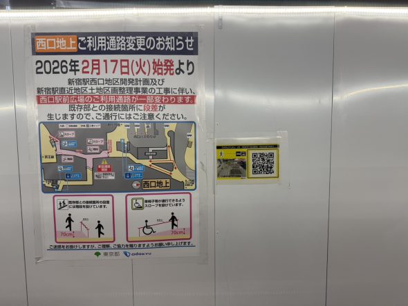 今回歩いていて特に印象的だったのは駅構内でした。西口地上へ向かう通路は工事の影響で何度も変更されており、あちこちに案内板や地図が掲示されています。地下通路には大型モニターの地図が設置され、「現在地」が何度も確認できるようになっています。